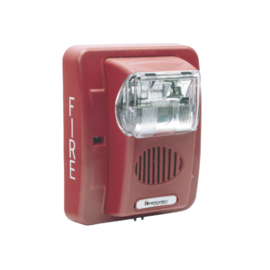 Sirena con lámpara estroboscópica, 2 hilos, montaje en pared. Color rojo o blanco. Disponible a 12V o 24V.